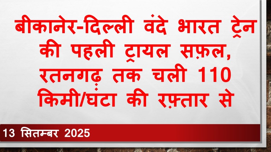 बीकानेर और दिल्ली के बीच चलने वाली वंदे भारत ट्रेन के चलने से पहले किए गए पहले ट्रायल रन को रेलवे ने सफल माना है। आठ कोचों वाली ट्रेन सुबह 9:30 बजे बीकानेर जंक्शन से रवाना हुई और यह रतनगढ़ जंक्शन तक 110 किलोमीटर प्रति घंटे की ऊँची रफ्तार से पहुंची।