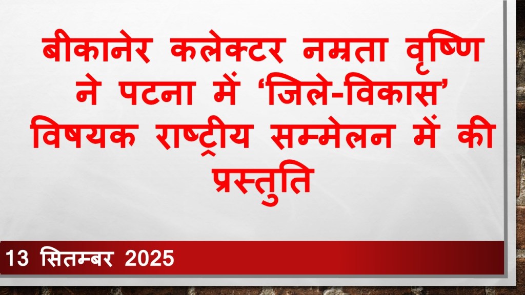 बिकानेर की जिला कलेक्टर नम्रता वृष्णि ने पटना, बिहार में आयोजित “Holistic Development of Districts” नामक राष्ट्रीय सम्मेलन में राजस्थान का प्रतिनिधित्व किया। सम्मेलन में उन्होंने अपने जिले के सफल मॉडल साझा किए, खासकर प्रारंभिक बाल शिक्षा (Anganwadi केंद्रों में मातृभाषा शिक्षा), स्कूलों में बिजली सुविधा, स्मार्ट-टीवी जैसे शैक्षणिक उपकरणों की तैनाती और सामान्य इंफ्रास्ट्रक्चर सुधारों पर बल दिया।